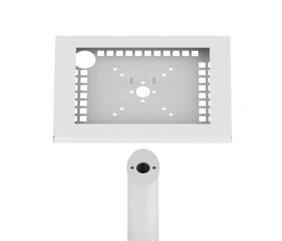 Tablet floor stand with universal tablet enclosure, suitable for all tablets within the indicated size range. The tablet holder is lockable with 2 screws and for extra safety you can add a key-lock. The tablet holder is mounted on the pedestal with a comfortable viewing angle of 45 degrees.