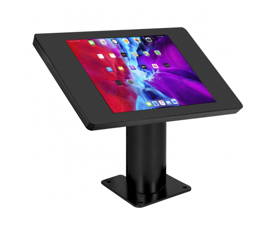 If you really want to present your tablet in a chic, custom-built enclosure on a table, counter or cabinet, then choose Fino. This sturdy metal stand features a square base plate with mounting holes and a 60 mm round standing tube on which a custom matte white or black plastic housing is mounted. The holder mounts securely to a horizontal surface such as a tabletop or counter, creating an extra sturdy and theft-proof structure.